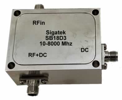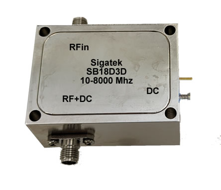 SigaTek offers a variety of broadband RF bias tees, networks that cover the frequency range of 30 Khz to 40 Ghz. Individual devices are designed for optical networking applications and can cover frequency bands from 30 Khz to 40 Ghz. These wideband RF bias tees, networks offer high isolation up to 60 dB Typ. with excellent VSWR, low insertion loss and high current handling up to 6 amps(custom designed). Voltage rating can be as high as 250 Vdc (custom designed). A selection of input and output connector options are available. Also, the DC port can be a RF connector or a DC pin.